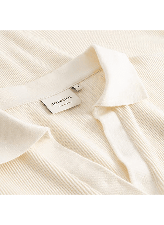 Damespoloshirt met normale pasvorm en een open geribde kraag. Korte mouwen met geribde mouwboorden. Recht gesneden voor een strak silhouet, met een rechte onderkant en kleine zijsplitten voor extra bewegingsvrijheid. In de kleur Whisper White, een gebroken witte tint, vervaardigd van zachte jersey met wafelpatroon voor een subtiele textuur. Gemaakt van biologisch katoen met Fairtrade- en GOTS-certificeringen, aangevuld met een vleugje elastaan voor comfortabele rekbaarheid. Draag het met de bijpassende short voor een relaxte set, of stop het in een wijde jeans met sneakers.