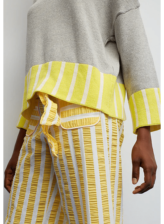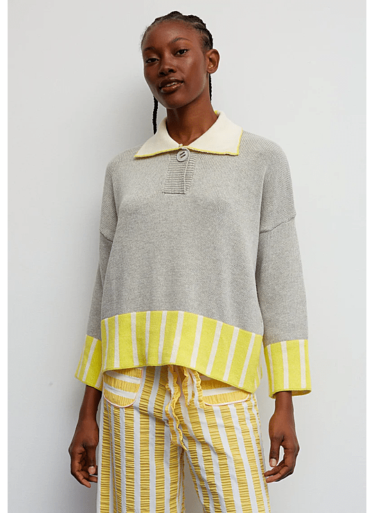 Een retro-geïnspireerde trui die een grijstinten body combineert met gele en witte strepen op de zoom en manchetten, waardoor een fris en energiek contrast ontstaat. De polo-achtige kraag, afgewerkt met een houten knoop en een casual flair, maakt hem bijzonder zonder aan comfort in te boeten. Met zijn rechte silhouet, natuurlijke val en zachte stof is het een perfect kledingstuk voor elke dag: comfortabel, flatterend en vol persoonlijkheid.Vertaald met DeepL.com (gratis versie)
