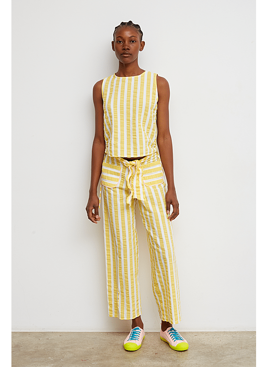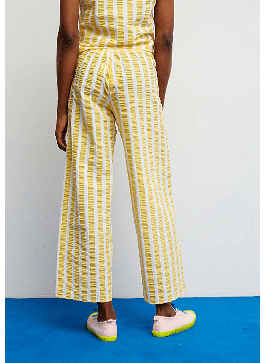 Een veelzijdige, heldere broek met details die het verschil maken. Het ontwerp heeft verticale gele en witte strepen die een fris, verlengend effect creëren, terwijl de strik aan de voorkant een uniek tintje toevoegt. De zakken zijn afgewerkt met contrasterende ecru biezen. Met een rechte, soepele snit is het een comfortabel en gemakkelijk te dragen kledingstuk, ideaal voor warme dagen. De lichtgewicht stof zorgt voor beweging en houdt het hele dag door een fris gevoel.