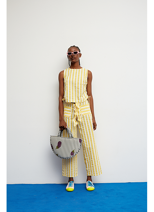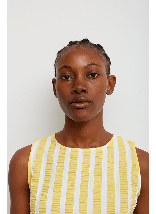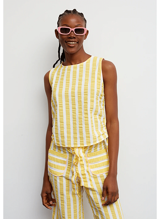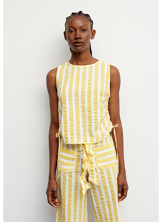 Een top die lichtheid en frisheid toevoegt aan zomerse looks. Het ontwerp combineert verticale gele en witte strepen op een stof met een subtiel reliëf dat textuur en beweging toevoegt. Dankzij de verstelbare bandjes aan de zijkant kan het silhouet worden gerimpeld, wat een persoonlijk en uniek detail oplevert. Met een ronde halslijn en een rechte snit is dit een lichtgewicht en comfortabel kledingstuk, perfect voor warme dagen.