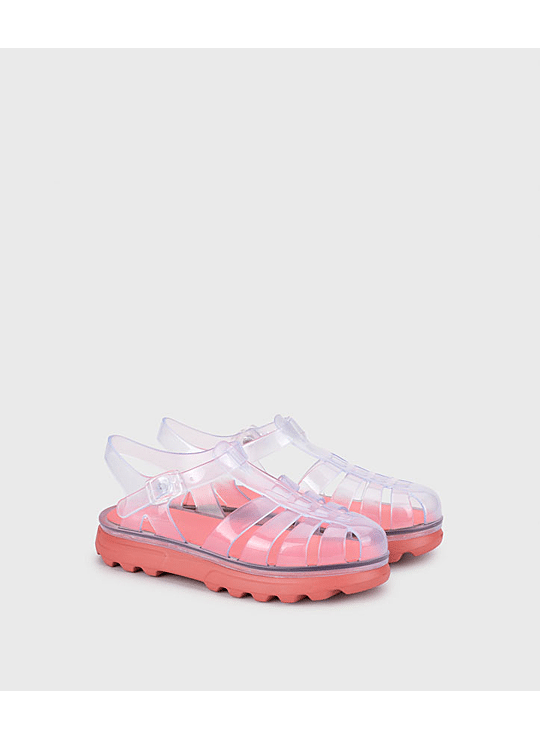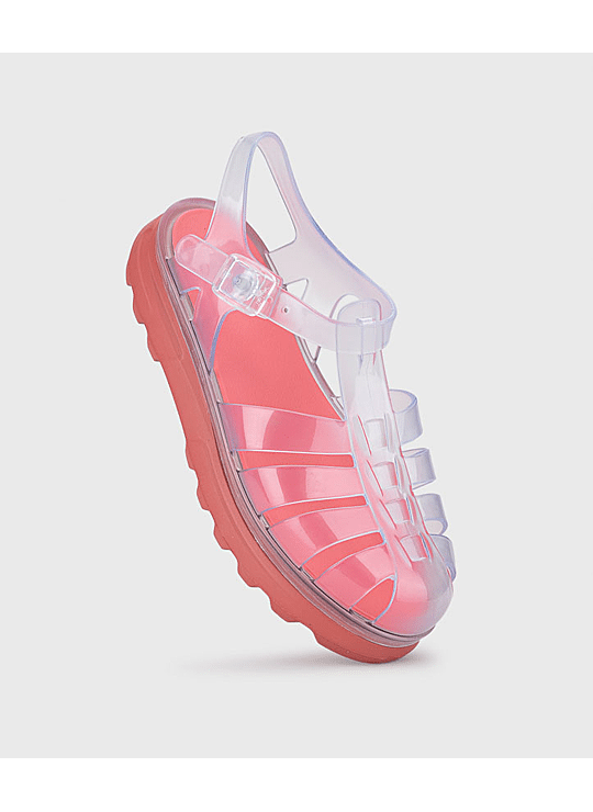 Retro-sandaal van kunststof met glanzende afwerking, plateauzool en gesp.