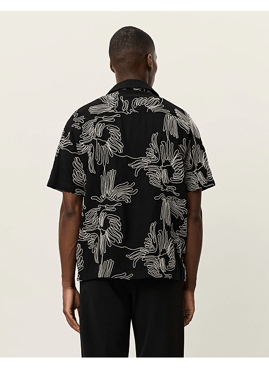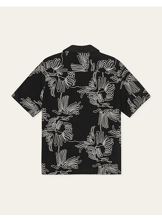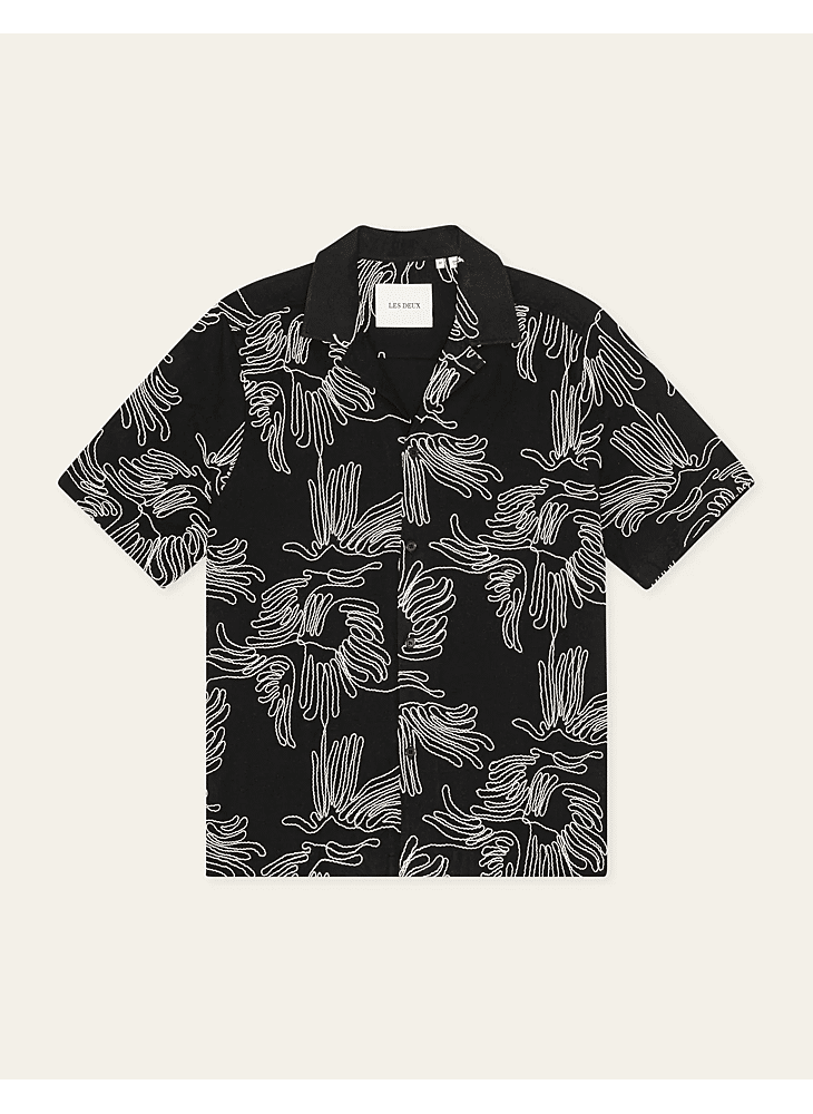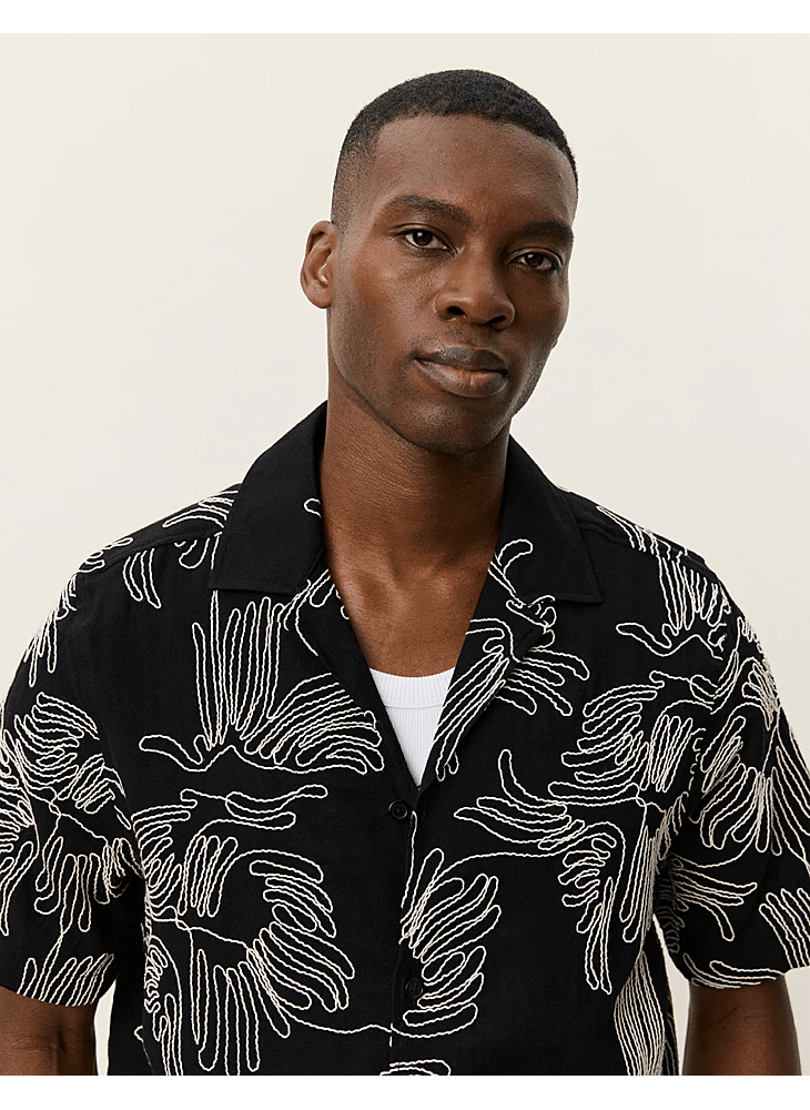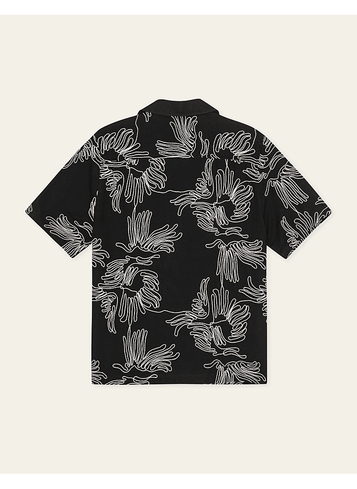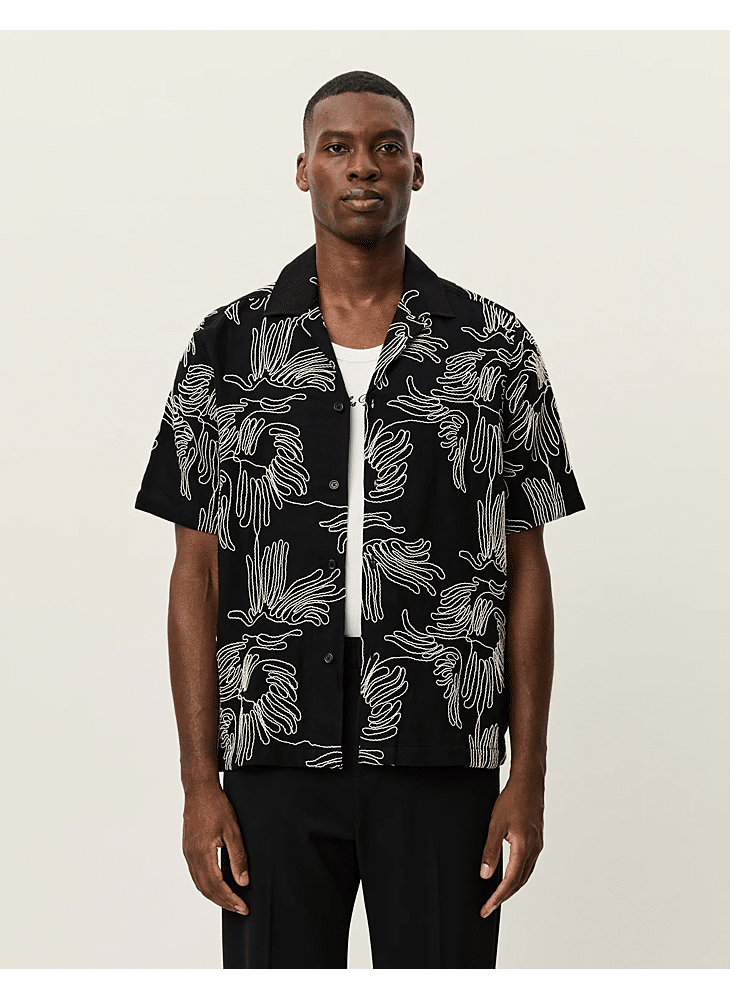 Een recht model overhemd met korte mouwen van een frisse katoenmix, gedetailleerd met contrasterende bloemborduursels over het hele oppervlak. Ontworpen met een relaxte campkraag en knopen met parelmoerlook die passen bij het kleurenpalet.