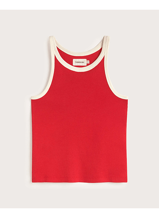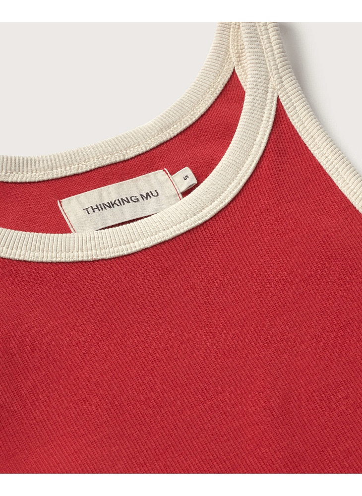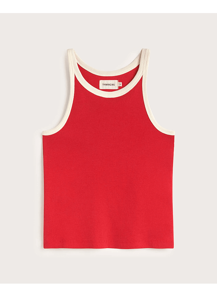 Harriet: rode haltertop met witte contrastrand, gemaakt van biologisch katoen.