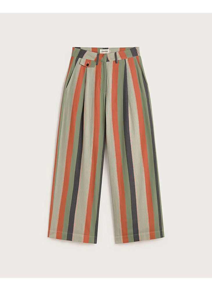 Broek met wijde pijpen en lage taille, met veelkleurige strepen, gemaakt van biologisch katoen